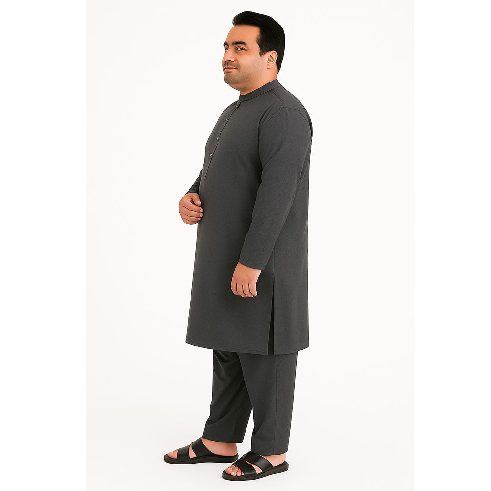 Minimal yet sophisticated, the Charcoal Premium Wash & Wear Kurta Pajama is tailored for plus-size men seeking comfort and polish in one. Its dark grey hue is perfect for both formal and casual wear. Made from soft, breathable, and wrinkle-resistant fabric, this ensemble includes a straight-cut kurta with a band collar and four-button placket, paired with a roomy pajama for relaxed wear throughout the day.📦 Fabric: