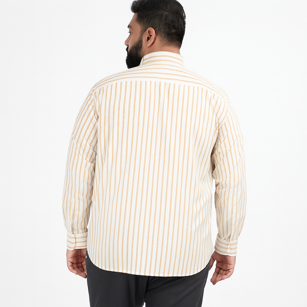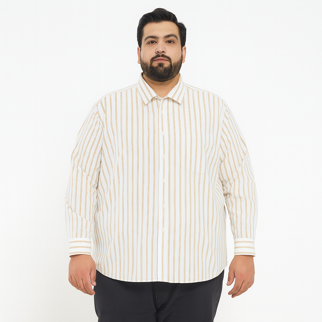 Add timeless charm to your everyday wardrobe with this Off-White Pinstripe Shirt, crafted exclusively for plus-size men. Featuring clean vertical stripes in neutral tones, this shirt delivers a sleek, lengthening effect while maintaining a casual vibe. Designed with a relaxed fit, button-down front, and classic collar, it pairs effortlessly with chinos, jeans, or trousers. A versatile must-have for casual Fridays, weekend hangouts, or relaxed evening dinners.