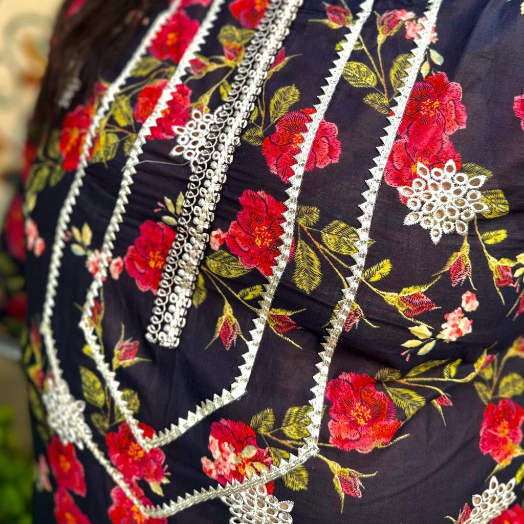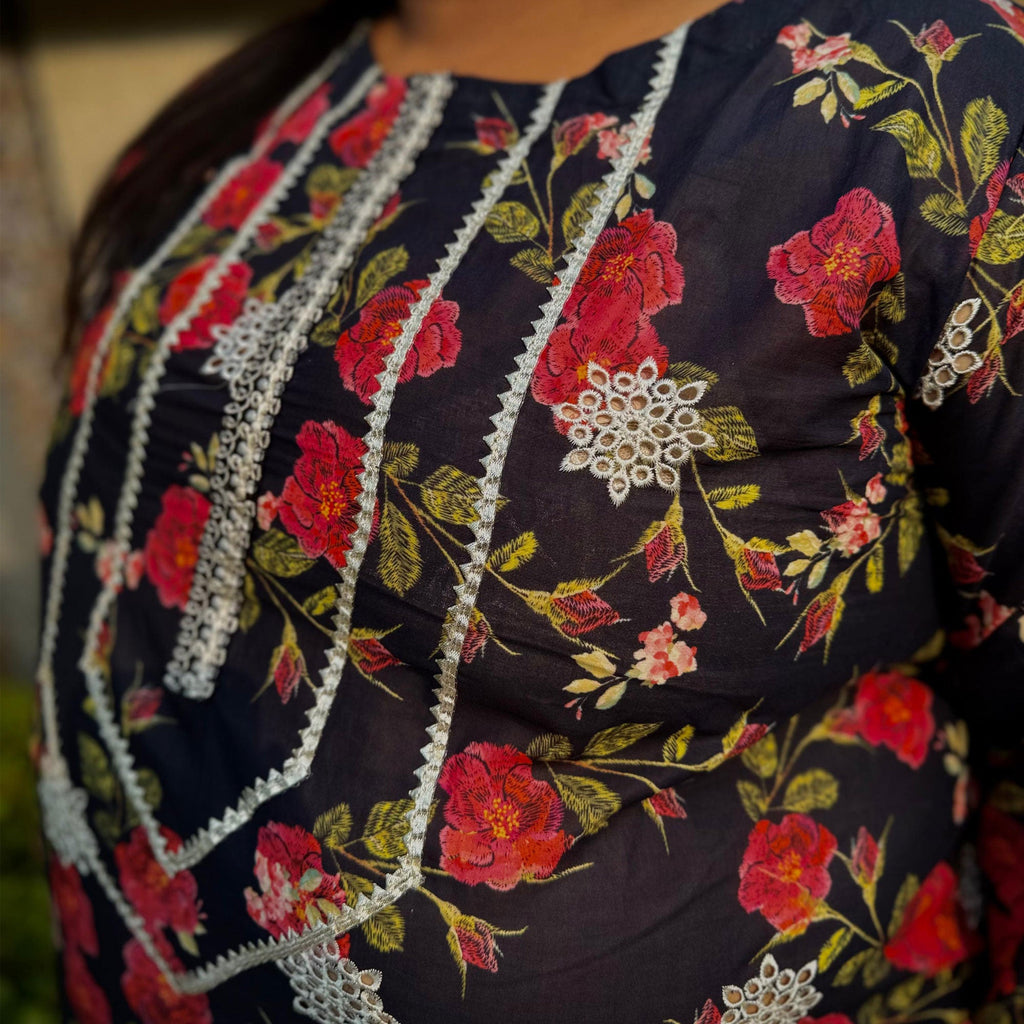Bold, elegant, and timeless — the Rose Noir Chikankari Kurti is a stunning addition to your plus-size wardrobe. Crafted for curvy women, it features vibrant pink rose prints on a rich black base, enhanced with delicate white chikankari embroidery and lace finishing.