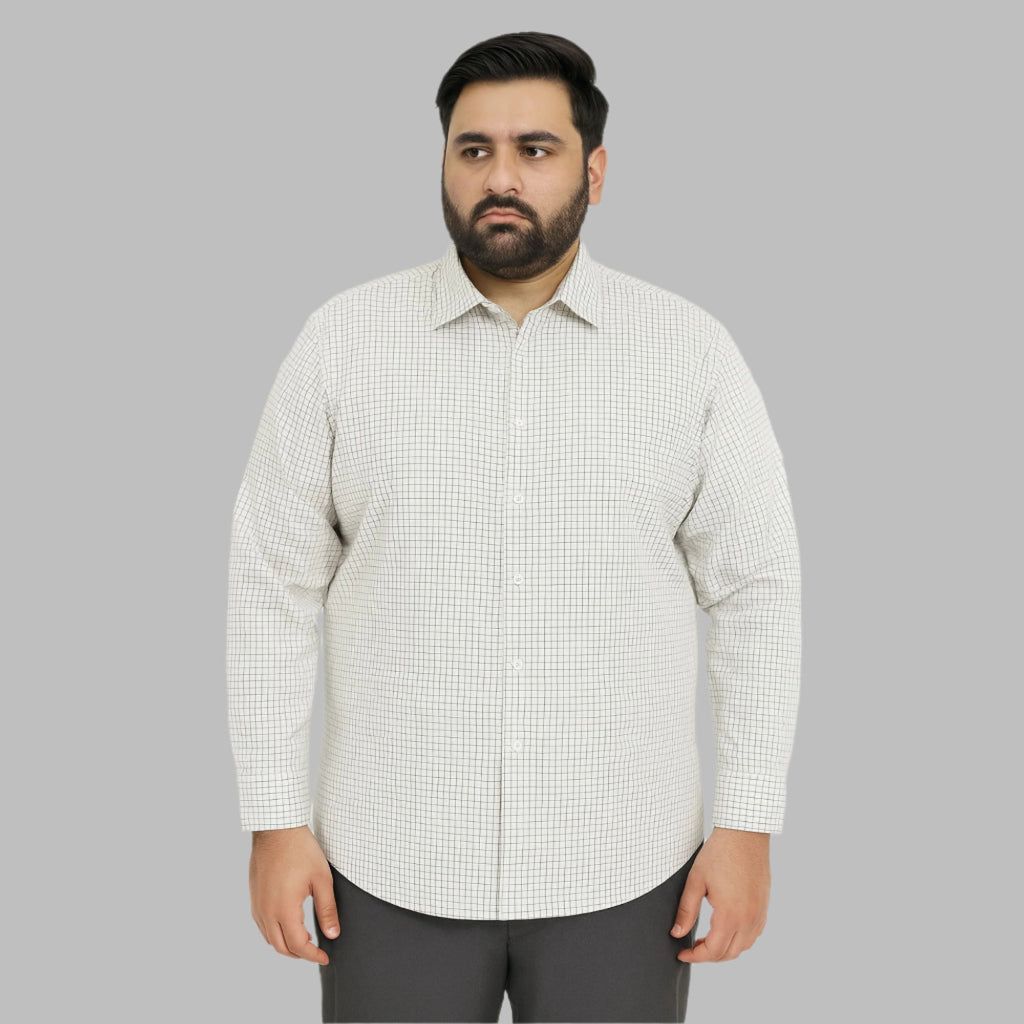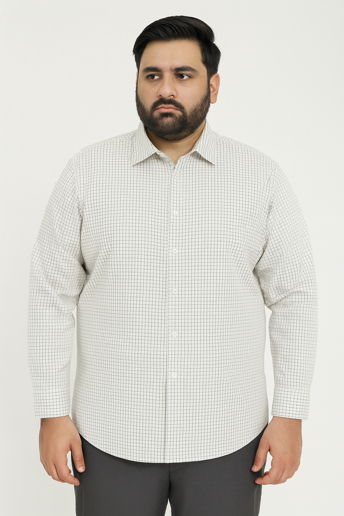 Clean and classic, this White & Black Micro Grid Check Shirt is designed for plus-size men seeking a subtle yet sophisticated style. Featuring a fine black check pattern over a white base, this full-sleeve shirt is made from a soft cotton-blend fabric for breathable comfort. Ideal for office wear or casual Fridays.